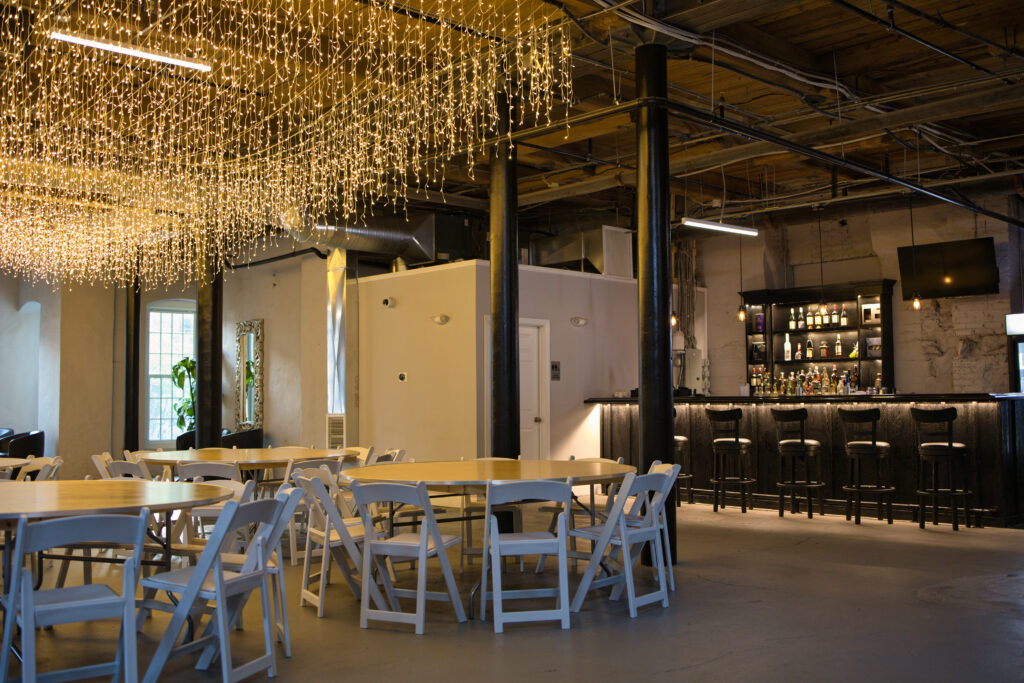 Features: Open floor plan, full bar with bartender service, floor-to-ceiling windows, access to outdoor areas, original mill architecture, polished concrete flooring, suspended string lighting